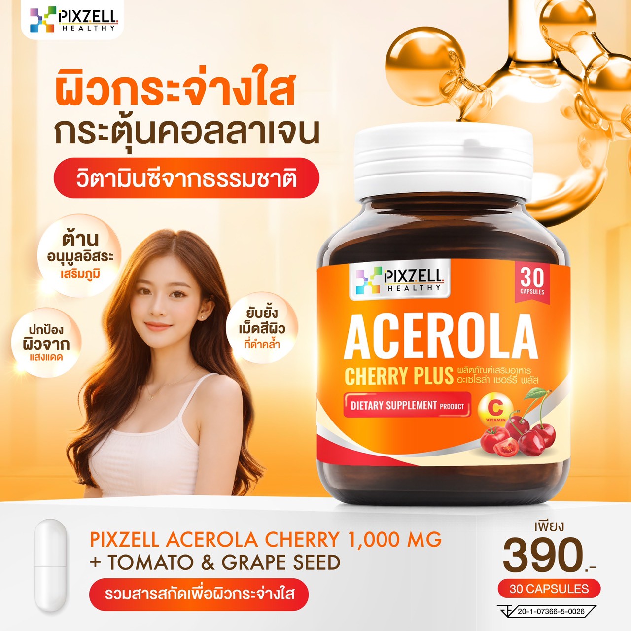 Pixzell Acerola Cherry 1,000 mg อะเซโรล่า เชอร์รี่ ผสมมะเขือเทศ ทับทิม และส้ม แบรนด์พิกซ์เซล จำนวน 30 แคปซูล