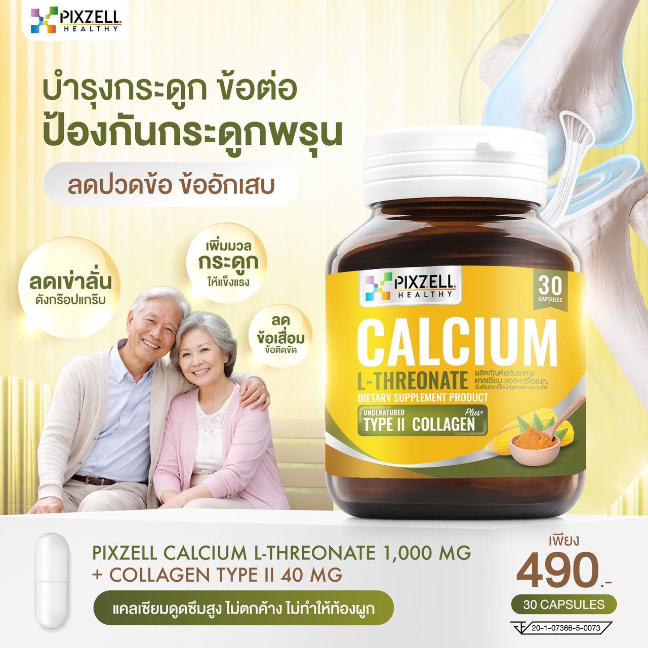 แคลเซียมสกัดจากข้าวโพด 1,000 มก. ผสมคอลลลาเจน ไทพ์-ทู 40 มก. ขมิ้นชัน และวิตามินดี
